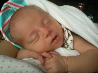 Since Ally was so small, we had to keep a close eye on her weight. She dropped down to about 6 lbs, 2 oz after birth, and was only eating 2-3 ozs at a time, but she was back up to 7 lbs, 4 oz last Monday at her 2 week check-up, and with the way she now eats 4-5 ozs every 2 hours (or less sometimes), I am certain she has gained even more since. She has already outgrown the preemie clothes she was wearing (which when we brought her home were the only clothes that didn't swallow her)! The first few days of being home, Ally slept 4 and 5 hours chunks at night, but now she is starting to get into a more regular 3 hour feeding interval. I miss getting that extra sleep all in one chunk, but I am happy that nursing is going so well and she is thriving. These sleepless nights will pass soon enough, I know.